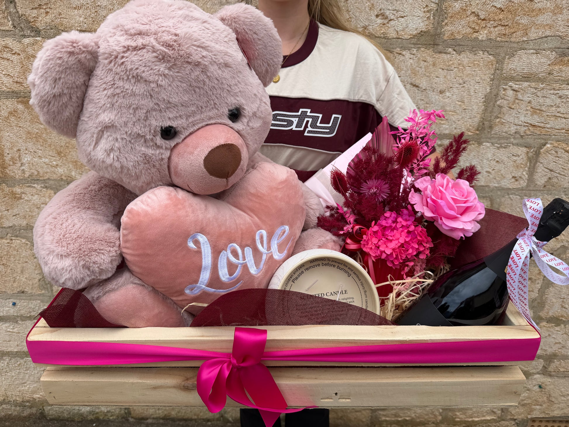 Spoil your Beau with our top of the range Supreme Luxury Hamper. Our Handcrafted Wooden box has a Soft Teddy, Bird in hand sparkling, chocolate, candle and faux/dried ceramic pot arrangement.